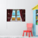 Visualizar através de uma janela com cortinas sobre um campo de feno e fardos