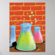 Experiências de Cartoon Science. Tubos de ensaio e frascos de vidro à frente de uma parede de tijolos sentada num banco de madeira.