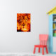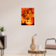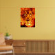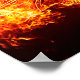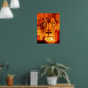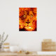 Arte digital de um rosto de leão flamejante com olhos amarelos piercing. A imagem usa vermelhos, laranjas e castanhos para criar um sentimento de calor intenso e determinado foco. Poster Flaming Lion Face.
