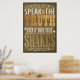 Fale a verdade, mesmo que sua voz trema. Dizem que a honestidade é a melhor política. Mesmo que você não acredite nisso, é mais fácil lembrar das coisas quando você não está mentindo. Esta poster tipográfica está aflita por um olhar vestido e desbotado.