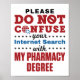 Um presente engraçado para o farmacêutico. Design diz: "Por favor, não confunda sua pesquisa na internet com meu diploma em farmácia."