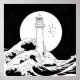 Uma ilustração de arte em linhas brancas e pretas do farol de Bell Rock na Escócia. Ondas enormes se cruzando na base do farol.