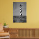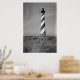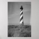 Uma fotografia do Farol de Cape Hatteras na Carolina do Norte. O Farol de Cape Hatteras é significativo como um importante auxílio à navegação na costa atlântica. Os Diamond Shoals que se estendem até 10 milhas de fora de Cape Hatteras, junto com as correntes da Corrente do Golfo, renderam a esta área sua reputação de "cemitério do Atlântico". Um farol foi estabelecido aqui em 1803, elevado em 1853. Foi substituído pelo farol atual em 1869-70. A atual torre de luz, pintada com espirais negras e brancas para reconhecimento durante o dia, é a torre de luz de tijolos mais alta dos Estados Unidos.