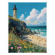Um farol clássico mantém-se firme num terreno rochoso, observando as ondas suaves do oceano. A praia se estende infinitamente, enquadrada por gramíneas altas e flores silvestres, criando uma cena costeira eterno. Um céu azul macio, pontilhado com algumas nuvens fofinhas, complementa a beleza serena da paisagem. Esta paisagem tranquila captura o poder silencioso da costa e a calma que ela traz.