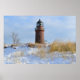 Um farol robusto de tijolos vermelhos está sozinho a guardar os mares durante o inverno. O chão áspero e rochoso está coberto de neve com gramíneas coloridas de trigo soprando suavemente no vento. Evoca uma sensação de solidão. Um céu azul com nuvens brancas e espertas.