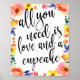 Um sinal de casamento elegante e moderno, apresenta o texto "Tudo o que você precisa é amor e um cupcake" em uma fonte de letra manuscrita extrovertida, a textura da pincelada adiciona um sentimento espontâneo e divertido. A cor do fundo pode ser personalizada de acordo com as suas necessidades e preferências, por favor entre em contato se tiver algum pedido especial.