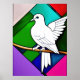 Fecho de uma ave branca sentada num galho numa janela de vidro manchado, coloração retrógrada. Representação de uma pomba contra um fundo geometricamente desenhado.