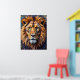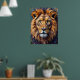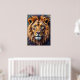 Esta pintura é um retrato intenso e detalhado da cabeça de leão, focado em seu olhar poderoso e mana texturizada. O trabalho de arte é renderizado com pesada carga técnica, com pinceladas grossas e ousadas que criam um senso de energia bruta e de natureza selvagem. O rosto do leão é uma mistura impressionante de tons laranja, marrom e ouro, e seus olhos amarelos brilhantes estão perfurando e cativando.