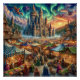 A cena é colocada num mercado medieval à beira de um grande castelo, com vendedores vendendo bens sob tendas coloridas como moradores em um período em forma de unha e troca. Os dragões majestosos voam no céu acima, acrescentando um elemento fantástico à cena de um mercado em chamas. A atmosfera se encanta ainda com um brilho etéreo, possivelmente a partir dos nortes, lançando uma luz mágica sobre toda a paisagem e destacando a intrincada arquitetura do castelo.