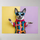 Feliz Animal com óculos escuros e roupas fascinantes dançando em dois tons - Tema do Partido Criativo. Óculos de sol esportivos adoráveis e uma roupa vibrante dança alegremente