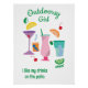 Poster de parede temática "Glamper", uma campista bonita. Criado com uma imagem de cocktails frutíferos coloridos e gravado com o texto "Garota à porta - Eu gosto das minhas bebidas no pátio." O texto é editável. Veja outros itens nesta mesma coleção no Zazzle.