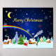Bonitas paisagens de neve com árvores de Natal, casas, um homem de neve, e um arco-íris sobre a neve caindo do céu. Papai Noel e uma rena caminhando juntos para distribuir presentes de Natal na noite de Natal.