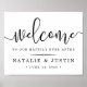 Bem-vindos convidados para o seu casamento com a nossa doce poster de criança, disponível em vários tamanhos. Design apresenta tipografia negra em branco nítido com "bem-vindo" no topo em um elegante roteiro de caligrafia manuscrito, e "...para a nossa alegria para sempre" e seus nomes e data de casamento abaixo.