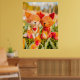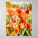 Duas raposas de feltro amavelmente aninhadas entre as tulipas florescentes, capturando uma atmosfera romântica de primavera com texturas de lã macia e cores vibrantes.