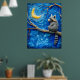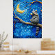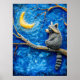 Uma escultura de feltro detalhada de um guaxinim descansando em um galho debaixo da lua de cheio brilhando. A cena noturna é lindamente capturada com texturas de lã macia e cores profundas.