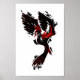 uma trabalho de arte decorativa de uma fênix mítica negra e vermelha que espalhou as suas asas.