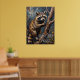 Esta pintura impressionante apresenta um guaxinim com seus olhos brilhantes olhando diretamente para a frente enquanto se segura em um galho de uma árvore nua. O fundo é uma mistura giratória de blues escuros e cremes mais leves, criando um efeito dramático mas suave. O texto "CUTE MAS FERAL" aparece corajosamente em letras brancas no fundo, capturando a essência da criatura selvagem