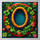 Ferradura e trevo oval dourado adornado com flores vibrantes e folhas verdes exuberantes. O fundo é escuro, destacando a flora colorida e dando um toque caprichoso e inspirado na natureza à composição.