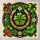 Ferradura e trevo para boa sorte, ferradura ouro cercada por luvas verdes e flores coloridas. O foco central é uma grande shamrock verde, com vários designs florais cercando a ferradura, criando um motivo vibrante e sortudo.