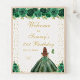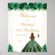 Esta elegante e glamourosa placa de boas-vindas de festa de aniversário apresenta uma bela princesa com cabelo vermelho castanho e pele clara em um vestido de bola verde. O texto combina o script manuscrito e as fontes sans serif modernas para um aspecto elegante e sofisticado. Os arranjos florais, borboletas e confete de ouro criam a mistura perfeita de rústicos e quicos. Gráficos por www.etsy.com/uk/shop/SunflowerDayLove