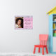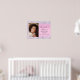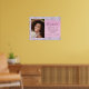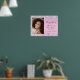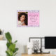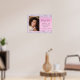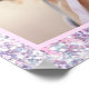 Lindo, glamoroso e feminino pôster de boas-vindas para festa de aniversário de 16 anos com foto dela, confetes holográficos roxos, rosa e prata ao longo das bordas contra um fundo rosa e seu nome em uma fonte moderna cinza suave.