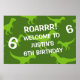 O tema do dinossauro T-rex é sinal de poster de boas-vindas. Diversão da design pré-histórica para crianças. Personalizar com nome e idade. Impressão de silhueta de dino verde.