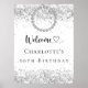 Um poster de boas-vindas para uma festa de aniversário entre cinzas e glamourosas 50ª (ou qualquer idade). Um fundo branco decorado com falso confete prateado. Personalize e adicione um nome e uma idade. Bem-vindos com o coração. Adicione uma dentro de foto à estrutura falsa de diamante.