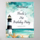 Belo poster de festa de aniversário com um farol preto e branco, estrelas-do-mar e conchas. Perfeito para uma festa de aniversário. As palavras podem ser alteradas para se adequarem aos seus próprios detalhes ou requisitos