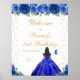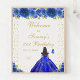 Esta elegante e glamourosa placa de boas-vindas festas de aniversário apresenta uma bela princesa com cabelo escuro e pele escura em um vestido azul real. O texto combina o script manuscrito e as fontes sans serif modernas para um aspecto elegante e sofisticado. Os arranjos florais, borboletas e confete de ouro criam a mistura perfeita de rústicos e quicos. Gráficos por www.etsy.com/uk/shop/SunflowerDayLove