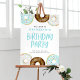 Bem-vindo a convidados para o seu evento com este sinal de boas-vindas personalizável à festa de aniversário. Apresenta rosquinhas de cor-de-água azul, branca e chocolate com espirais coloridas. Personalize isto adicionando seus próprios detalhes. Este sinal de aniversário de rosquinha está disponível em outras cores.