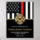 Este design apresenta uma bandeira de bombeiros com listras pretas e brancas, e uma fina faixa vermelha também. Um crachá de bombeiro fica acima de todos os detalhes da festa para o bombeiro aposentado, tenente ou festa de aposentadoria do chefe. Os convites também podem ser personalizados para um bombeiro aposentado.