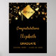 Um fundo preto chic. Decorado com estrelas ouros e um boné de ouro moderno e abstrato, chapéu, tassel com dentro de ano. Personalize e adicione um nome, nome da escola/ano. O texto: Parabéns e o nome são escritos com um grande script de estilo escrito à mão moderno. Uma poster de boas-vindas para uma festa de formatura.