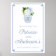 Flores Azuis e Brancas Clássicas em um vaso de Jarra de Gengibre decoram este design de placa de boas-vindas da festa. Mostrado aqui para uma Festa de Noivado, mas todo o texto pode ser personalizado de acordo com as suas necessidades.
