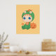 Bebê adorável vestida com uma fantasia de dragão verde com picos de laranja e combinando um bico de laranja com um crânio. Uma abóbora curvada fica um pouco para trás.