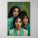 Um retrato elegante de três mulheres em blazers azul-turquesa, celebrando beleza, força e unidade com expressões ousadas e texturas ricas.