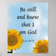 Salmo 46:10. Fique quieto e saiba que eu sou Deus. Escritura inspiradora com girassóis brilhantes.