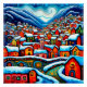 A.I. assistiu impressão de uma vila vibrante e surreal dentro de uma paisagem de fiorde é colocada contra um céu noturno estrelado, com casas coloridas cobertas de neve.