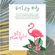 O design de convite para chá de fraldas apresenta flamingo cor-de-rosa com frondes verdes de palma e flores de hibisco tropicais. "Aloha Baby". Um padrão floral tropical com cor preta de fundo se veste na parte de trás do cartão. Vamos Flamingle!