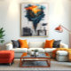 Surrealist art of a suspended forest on a floating island with vibrant sunset. Watercolor style with artistic splatters. Perfect for murals, interior decoration and posters. Bring nature and imagination to your space with this calm and inspiring work in warm and cool colors. Ideal for modern rooms.