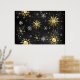 Fundo de Natal preto com flocos de neve de joias douradas e pretas. Flocos de neve ouro. Natal.