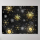Fundo de Natal preto com flocos de neve de joias douradas e pretas. Flocos de neve ouro. Natal.