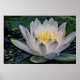 Flor branca de Lotus brilhante com centro amarelo flutuando numa lagoa
