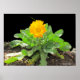 Laranja Blossom, o primeiro florescimento desta primavera, este calendário floresce contra um fundo negro. Folhas verdes brilhantes contrastam com a terra escura.
