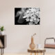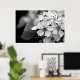 Apresenta uma foto de close-up em preto e branco de lindas flores de cereja.