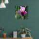 Flor rosa-íris, bonito e beijada por sol, em flores de cheio e botões de flores no fundo, com caules e folhas verdes compridas. Belo poster floral para casa ou escritório. Fotografia original © 2009 TamiraZDesign.