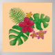 Um lápis de aquarela que fiz de uma flor rosa tropical cercada por folhas verdes.