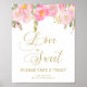 O amor é doce, por favor, pegue um sinal de tratamento com design floral rosa e dourado e bela caligrafia. Este design feminino em aquarela tem flores cor-de-rosa e douradas com um toque de verde. Apresenta letras elegantes à mão e tipografia em dourado, com "O amor é doce" escrito à mão em caligrafia espiralada. Por favor, explore minha loja para encontrar itens correspondentes.
