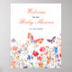 Bonito sinal de boas-vindas ao chá de panela com flores coloridas em rosa, roxo e laranja, borboletas e folhagem. Perfeito para primavera ou chá de panela de verão. As palavras podem ser alteradas para se adequarem aos seus próprios detalhes ou requisitos.