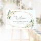 Adicione um toque pessoal à celebração do seu chá de fraldas com estes itens de na moda e festa memoráveis! Design apresenta flores brancas de aquarela, verde e estrutura dourada sobre fundo branco.