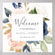 Este poster de casamento branco e marinho florescente é perfeito para um casamento floral. O clássico e elegante design apresenta marinho de aquarela azul e flores cor-de-rosa pinceladas. Personalize o poster com o nome da noiva e do noivo, e a data do casamento.